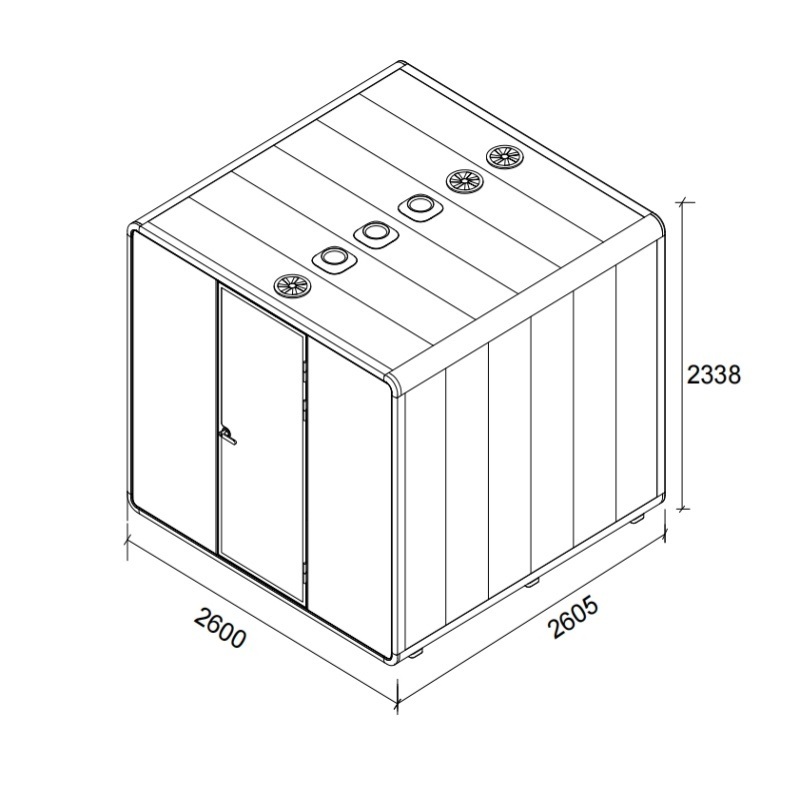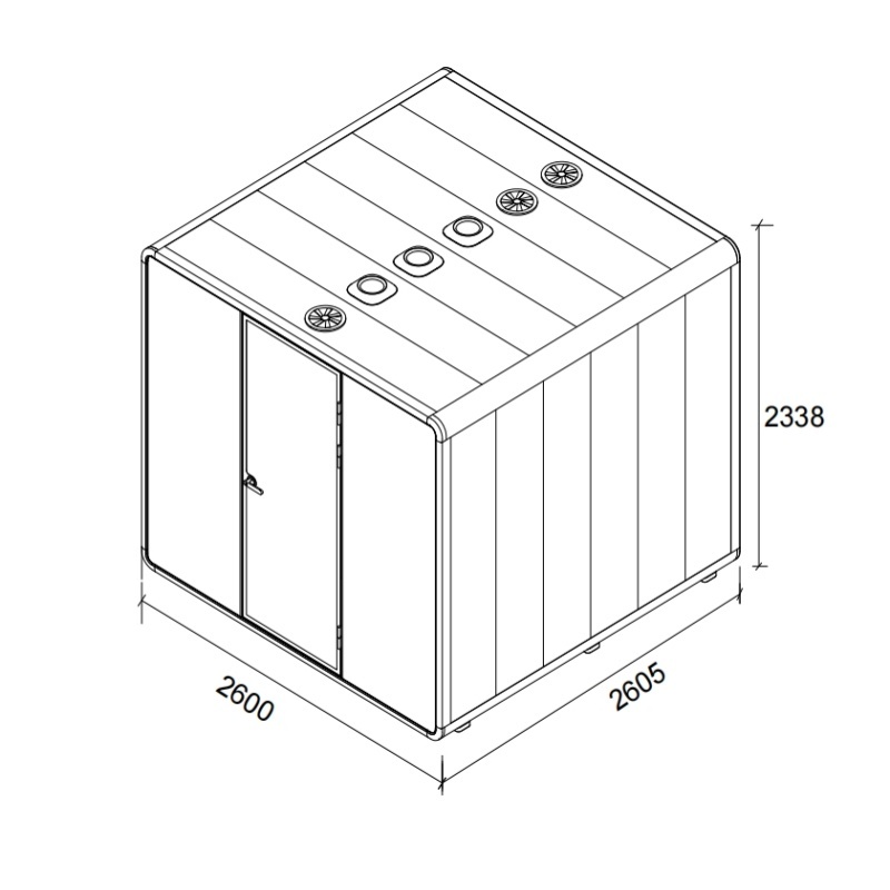 | Εξωτερικό μέγεθος: | W2600*D2605*H2338mm | Υλικά: | Χάλυβα, Αλουμίνιο, Ακουστικές πλάκες από ίνες, στρωμένο γυαλί |